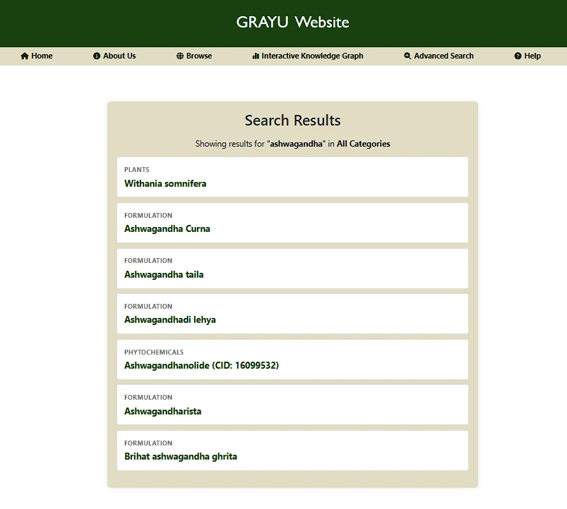 The Interactive Knowledge Graph allows you to explore the relationships between Ayurvedic formulations, plants, diseases, and phytochemicals seamlessly in a visual format.